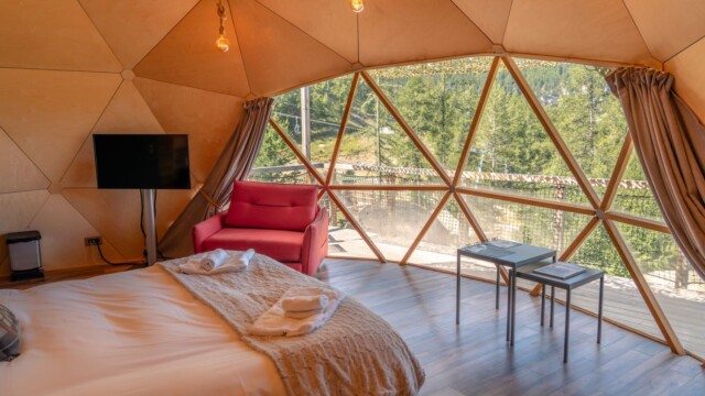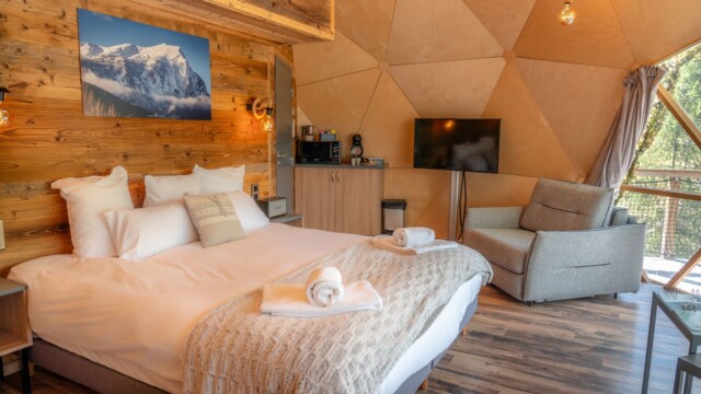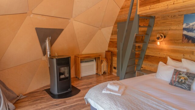 On a passé une nuit dans un Dôme Luxe en couple, un moment inoubliable.A notre arrivé, nous avons eu un petit goûter offert, une belle attention.Le Dôme Luxe a une baignoire balnéo qui donne directement sur la vue de la montagne, c'est magnifique. Le lit est super grand et super confortable !Le petit déjeuner était très bon ( croissant, pain, beurre, confiture, thé, café, chocolat chaud, jus de pomme)On a passé un excellent séjour, nous reviendrons !