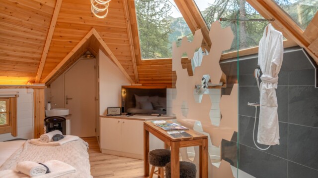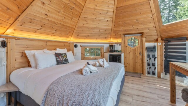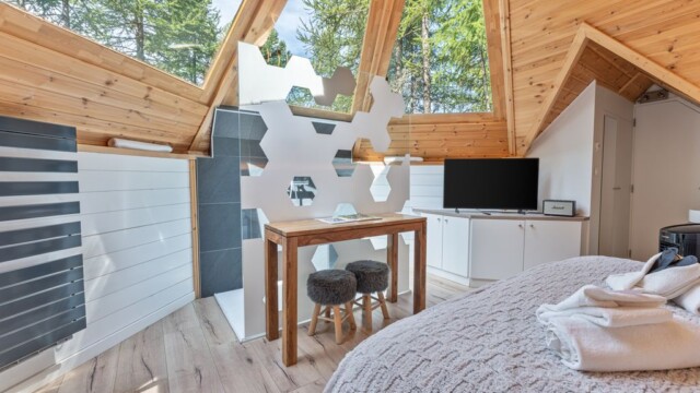 Les Kotas d’Alpin D’hôme, inspirés des cabanes finlandaises, sont des éco-lodges en bois conçus pour offrir une expérience authentique et immersive au cœur de la nature. Intimes et chaleureux, ils sont parfaits pour une escapade romantique à deux, invitant à la déconnexion et à l’évasion. Équipés de lits confortables et construits avec des matériaux durables, ces cocons offrent une vue directe sur les étoiles et s’intègrent harmonieusement dans le paysage.