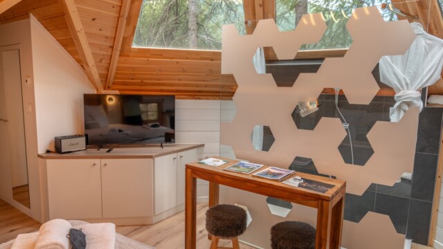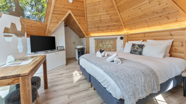 Le Dôme Luxe a une baignoire balnéo qui donne directement sur la vue de la montagne, c'est magnifique. Le lit est super grand et super confortable !